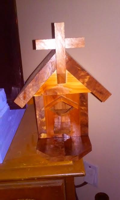 Let me share also a beautiful blessing my husband received from a customer. It was originally designed to be a birdhouse, and while i think it would be gorgeous on the front porch, my hubby says it's too pretty to put outside, so I have put a tiny little nativity I have on it to remind use we need Jesus everyday and set it up on our entertainment stand. The guy that made this does it as a hobby, and would not take any money for it. The particular day hubby brought it home was a bad day for me, and I sort of felt like it was the Lord's personal touch in our lives when hubby received this item.